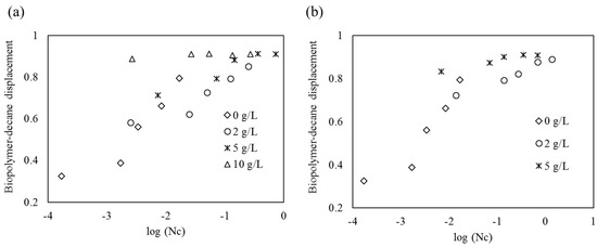 Biopolymer solution-decane displacement according to the change in capillary number log (Nc), (a) PEO; (b) SA.