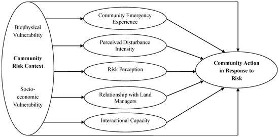 Interdisciplinary research on community wellbeing, forest-based communities, and disaster and risk has identified an array of influencing factors of community perceptions and actions in response to forest disturbances [94]. This study adopts a mid-range theoretical model of community response to risk (Figure 1) in structuring the analysis and presentation of findings. Such a social–ecological approach emphasizes the roles of community variations and community risk context consisting of local biophysical and socioeconomic vulnerability conditions. The community context is a multifaceted structural setting in which local sociocultural factors are embedded. The conceptual framework also outlines five additional key determinants of community activeness in response to forest risks: (1) collective community emergency experience; (2) perceived intensity of disturbance; (3) community risk perception; (4) relationship of community residents with land managers; and (5) interactional capacity of local people to work together on common issues.