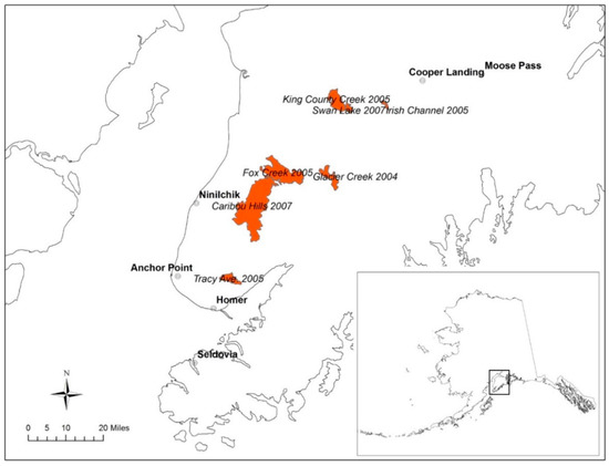 Map of the study communities and major wildfires during March 2004–February 2008 on the Kenai Peninsula, Alaska. Source: [91]. Reprinted with permission of Springer.
