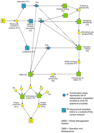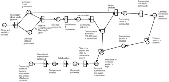 A few years later, the composting centre was then replaced by a bio-digester installation. After the budget termination, the composting centre was still run by the existing Community Based Organisation (CBO). However, with no further financial help from the government, production could not sustain itself, and therefore the operation was terminated 15 years after the project started. Since the community’s paradigm on waste had changed, they still maintained the waste segregation activities. The segregated waste was then sold or reused by the women’s organization (My Darling) for making handicrafts. In addition to this, the existing CBO tried to seek financial support by submitting proposals to international and national non-governmental organizations (NGOs) [21]. Eventually, with assistance and consultation from academic scholars, the Environmental Agency and a local NGO, and financial help from the local bank, the composting system was changed to a bio-methane system, which produces biogas for households and liquid fertilizer. A recent study investigated the economic and social impacts of the biogas system, and found that the system is not economically feasible but it is socially accepted by the community [22]. The practical model of this case study is represented as a Petri-net in Figure 2 and the legend of places and transitions is in Table 1.