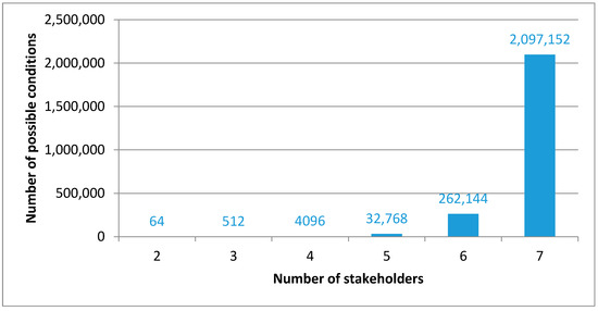 The number of stakeholders simulated in the model may vary, depending on the observed case study. As shown in Figure 3, the expanded model includes three subnets where the autonomous properties were assigned to each stakeholder involved in the decision-making process. The expanded model can accommodate various numbers of stakeholders. As more stakeholders are involved, the number of possible conditions will increase exponentially, hence the complexity in evaluating the outcomes from all possible conditions likewise increases. Figure 4 presents the number of possible conditions if there are three properties included in the model and two property variations: autonomous and non-autonomous. The graph shows that the number of conditions is exponentially grows as more stakeholders are involved in the decision-making process.