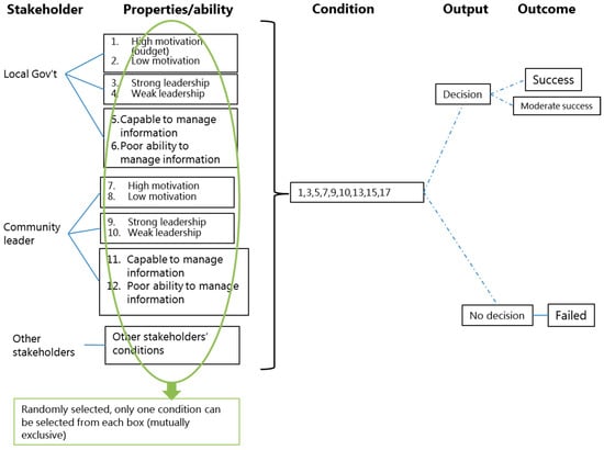 This section describes how decision-making conditions are formed, the classification of the decision-making conditions into three categories based on the level of autonomy exhibited. Decision-making conditions are built through combining the stakeholders’ properties. As previously mentioned, there are seven stakeholders’ autonomous properties identified. For the simulation purpose, we selected only several important properties in decentralized decision-making. Malone (2004) stated that decision information, trust, and motivation are among the important factors necessary for applying decentralized decision-making [23]. On the basis of this source, the autonomous properties selected for the simulation are: (1) motivation or initiative; (2) leadership; and (3) ability to manage information. Moreover, the analysis of five various decision-making cases showed that a proactive community (leaders and members) contributes to the success of a project. The proactive trait is an actualization of two properties combined, which are motivation or initiative, and leadership. This is one of the reasons why these two properties are among the first to be included in the simulation.