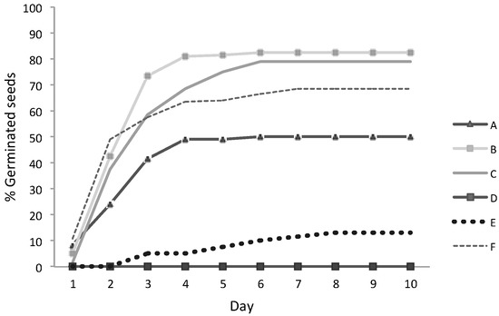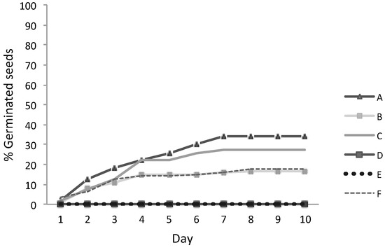 Phytoremediation is an emerging technology that uses plants and their rhizosphere to extract, detoxify, and sequester pollutants (organic and inorganic) from soil, sediments, and water [8]. This technology can be considered a lower cost–benefit alternative compared to mechanic or physic-chemical processes [9]. The pollutant uptake by plants depends on pH, organic substances, metal content, and other elements in the rhizosphere [2]. Seed germination is the first step of a plant’s life; it is one of the most sensitive processes in their physiology. Germination can be affected by hormonal interactions and environmental factors, both biotic and abiotic, such as a metal presence [10]. Seed germination studies are requisite groundwork to determine if plants are suitable for growth in polluted soils for phytoremediation applications [8]. Unfortunately, predicting the response of organisms simultaneously exposed to more than one PTE is a difficult task in environmental toxicology [4].