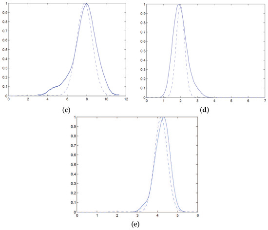 Therefore, in order to display the information of the raw data fully, after taking all circumstances mentioned above into account, we recommend using the fuzzy number to represent this type of sub-index data for completely and actually communicating the information about AQI every day. To further explore what sort of fuzzy number it belongs to, we draw a great deal of frequency distribution curves of daily 24 IAQIs for each pollutant. For simplicity, we take the IAQIs of SO of one day in six months that are figured out based on the raw concentrations gathered from the environmental monitoring centers and Equation (3) as a sample (see Table 4) to show the specific frequency distributions of these data as the solid lines shown in Figure 1. Certainly, the similar distribution curves can be also obtained for other types of pollutants at different moments.