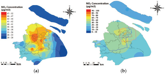 (a) The spatial distribution of NO concentrations in Shanghai in 2014; (b) the spatial distribution of NO concentrations in Shanghai in 2015.