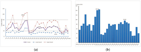 (a) The expectation line, the upper and lower bound lines of the AQI in January 2015 in Shanghai; (b) the histogram of the expectation for AQI in January 2015 in Shanghai.