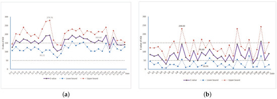 The expectation line, the upper and lower bound lines of the AQI in January 2015 in City A (a) and City B (b).
