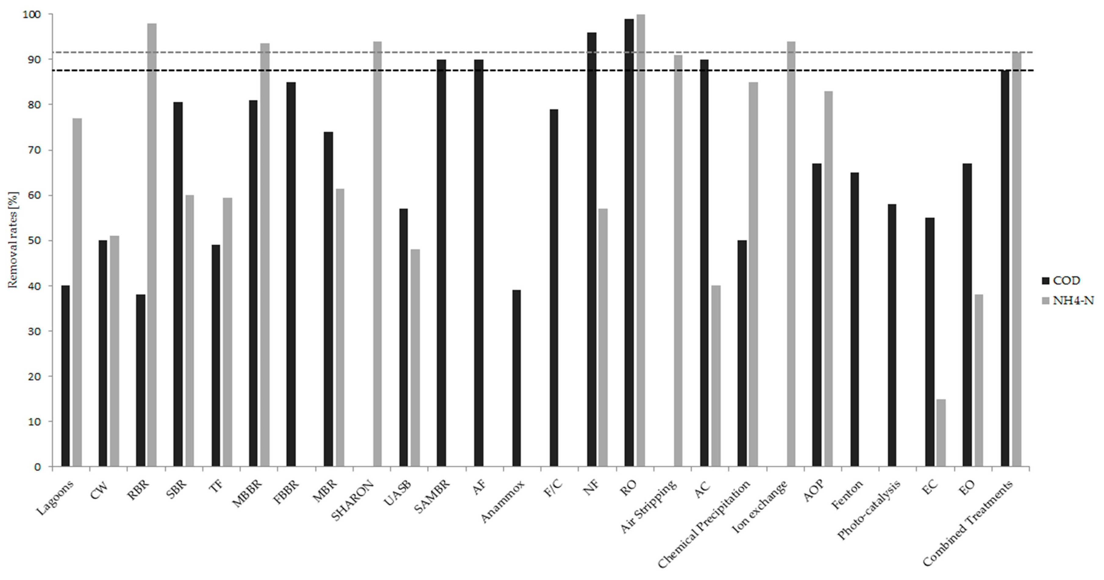 Since the reactor generally consists of the oxidation, nitrification and denitrification stages, it is designed to be particularly effective for the removal of nitrogen, phosphorus and COD. The efficiency of leachate nitrogen removal could reach values around 90%, but only 20% for COD [56]. Improving operating conditions, the MBBR process allows removing 85%–90% of the ammonia and 60%–81% of the COD contained in landfill leachate [27]. Moreover, introducing aerobic conditions after anaerobic stages, COD removal reaches 92%–95% while ammonia reaches over 97%, making the MBBR process attractive and promising to apply in the treatment of highly concentrated wastewater [57].