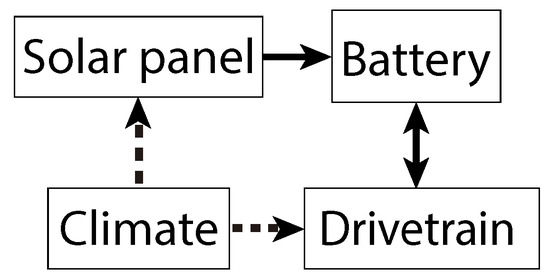For a solar car simulation, three main models should be coupled together: battery, motion equations (energy consumption) and solar panel (input). The environmental conditions affect the energy input via radiation and temperature and the energy output mainly because of the wind that influence the drag force. Then, they are considered into an independent module of the race model. Figure 1 illustrates the interactions between modules on the model.