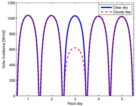 Solar irradiance for the first 5 days of the race. In the case of Cloudy day, the irradiance of day 3 is reduced to the 60% of the clear sky estimation.