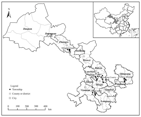 22]. Specifically, all 86 counties or districts in Gansu Province were sorted from high to low by the average total industry output value per capita in 2012, which is an indicator of the level of economic development. The counties were then divided into five groups, and a county district was randomly chosen from each group to represent that group. Within each county, five townships were randomly chosen, generating totally 25 townships in the sample. The five selected counties were Xifeng district, Yuzhong county, Mingle county, Huining county and Ming county, which represent the majority of farmland types and planting models in Gansu Province (