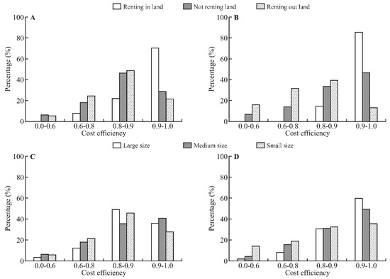 Figure 3A,B) indicated that a large share of wheat farmers renting land (70.00%) had a cost efficiency score in the range of 0.9–1.0, which was larger than that of farmers not renting land (28.94%) and renting out land (21.62%). In addition, a large share of maize farmers renting land (85.42%) had a cost efficiency score in the range of 0.9–1.0, which was larger than that of farmers not renting land (46.38%) and renting out land (13.16%).