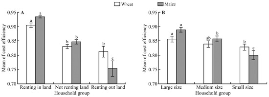 Figure 4B). As expected, wheat famers renting land had higher mean of cost efficiency (0.905) than those of not renting land (0.830) and renting out land (0.813); maize farmers renting land also had higher mean of cost efficiency (0.934) than those of not renting land (0.846) and renting out land (0.753). Similar results were also found for household groups depending on planted area size: wheat farmers with large size had higher mean of cost efficiency (0.856) than those with medium size (0.839) and small size (0.828); and maize farmers with large size also had higher mean of cost efficiency (0.888) than those with medium size (0.856) and small size (0.800).