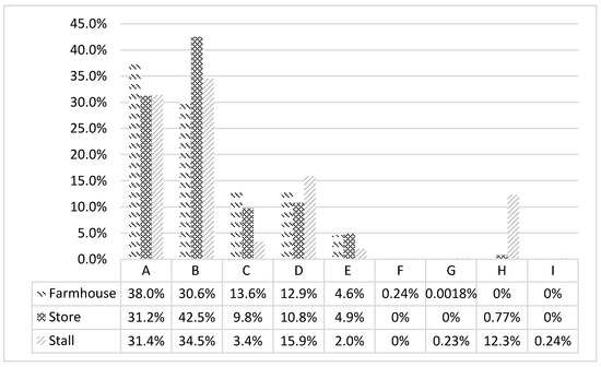 For one trip, carbon emissions from the farmhouse-type are the highest (25.21 kg), followed by the stall-type (2.93 kg), and finally the store-type operations (2.13 kg), which emit the least amount of carbon dioxide. For each 10,000 yuan in revenue, carbon emissions of the farmhouse-type operations are the lowest (1278.14 kg), followed by the store-type (2049.84 kg), and finally the stall-type operations (4356.74 kg), as indicated in Table 7.
