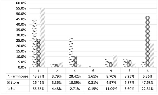 The primary sources of direct carbon emissions for these three types of operations are electricity and firewood, accounting for 69%, 74%, and 66% of the total direct carbon emissions, respectively (Figure 3). For the farmhouse-type, the key sources of indirect carbon emissions are food (43.87%), residences (28.42%) and transportation and communication (8.70%). For the store-type, the key sources of indirect carbon emissions are other consumption and services (47.68%) and food (26.41%), while for the stall-type, the key sources of indirect carbon emissions are food (55.65%), and other consumption and services (22.31%) (Figure 4). This is related to the tourism products and services provided by each operator type, and is consistent with their respective characteristics.