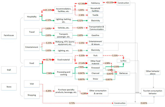 Main processes of rural tourism carbon emissions. The red line segments represent indirect carbon emissions and the green line segments represent direct carbon emissions. The thickness of the line segments indicates the proportion of carbon emissions contributed by the respective source in the tourism industry.