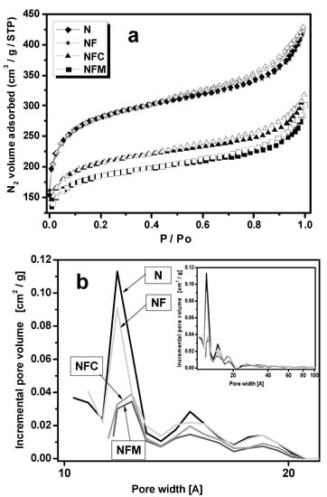 | Carbon Samples | Iron Content (m %) | SBET (m2 g−1) | Vtot (cm3 g−1) | Vmeso (cm3 g−1) | Vmicro (cm3 g−1) |