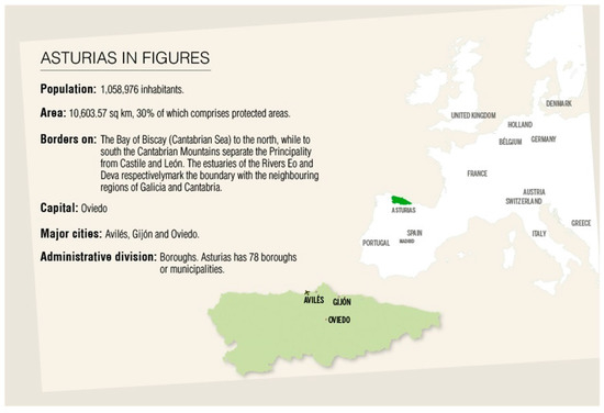 Asturias is one of the 17 Spanish Autonomous Communities and is situated on the northern coast of Spain. Its extension covers an area of 10,603.57 km2 [32]. Asturias is bordered by the province of Cantabria to the east, by Castilla y León and the mountain range known as the Cordillera Cantábrica to the south, by Galicia to the west, and by the Cantabrian Sea to the north (Figure 1).