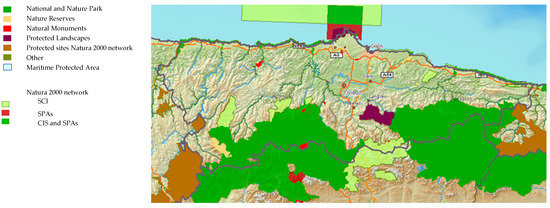 Nature and the countryside are very important aspects of the global governance of Asturias, which seeks for protected areas to contribute to sustainability (environmental and biodiversity), which will provide social and economic benefits by supporting local livelihoods. As an indicator, the Sites of Community Interest (SCI) represent nearly 30% of the total area of Asturias, and the protected area includes one national park, five nature parks, 10 nature reserves, and 10 protected natural areas, as well as 40 natural monuments [33,34,35]. Some zones are protected by different figures at the same time (see Table 2 and Figure 3).