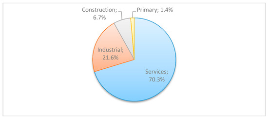Industry is important in Asturias, especially in the central area, in which over 50% of the total population of 1,034,681 was concentrated in 2017 [36]. Nevertheless, the services sector has increased significantly in importance in recent decades, and its contribution to the economy now represents over 70% of the gross value added GVA (see Figure 4). According to statistics from the Tourist Information System of Asturias [37], tourism activities represent 10.3% of GVA, with 2,204,941 tourists lodged in collective tourism accommodation; this increasing by 5.03% in 2016. Overnight stays increased by 7.68%, with a total of 5,306,249 [38].