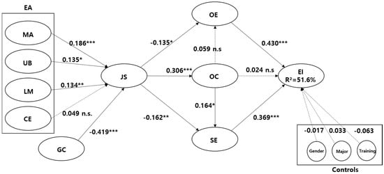 Results of this study. Major Accomplishment (MA)/University Brand (UB)/Labor Market (LM)/Confidence for Employment (CE)/Gap in Work Condition (GC)/Job Satisfaction (JS)/Outcome Expectation (OE)/Self-Efficacy (SE)/Entrepreneurial Intention (EI)/Overconfidence (OC). * p < 0.05; **p < 0.01; *** p < 0.001.