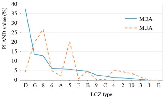 Figure 5 shows the proportion of each climate landscape area, that is, percentage of landscape (PLAND). Low Plants occupies the largest area in the MDA, but it is much less in the MUA. Areas of Large Lowrise and Open Midrise account for the largest proportion in the MUA. With larger area proportions in the MUA than in the MDA, most built-up landscapes are concentrated in the core area of the city, and are surrounded by a large number of agricultural landscapes. The total proportion of vegetation in MUA is less than 12%. Due to the lack of vegetation, water is the most important compensation landscape in Wuhan. It is noteworthy that the area proportion of Water in the MUA is 19.7%, which is greater than the proportion of Water in the MDA.
