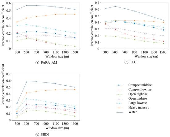 Pearson correlation coefficient between landscape metrics and LST in different window sizes: (a) PARA_AM; (b) TECI; (c) SHDI.