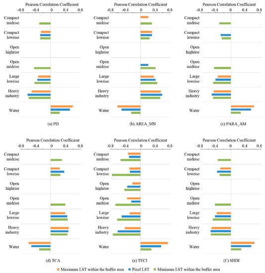 Comparison of Pearson correlation coefficients between landscape metrics and LSTs: (a) PD; (b) AREA_MN; (c) PARA_AM; (d) TCA; (e) TECI; (f) SHDI.