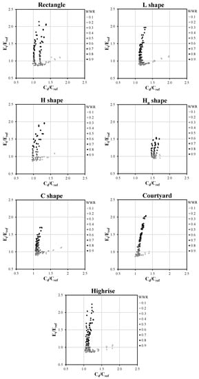 For all building shapes, a WWR of approximately 40% resulted in both the minimum energy consumption and the summer discomfort time. However, the position and degree of extension of the point sets in the quadrant for various shapes were different. Most obviously, the Ha type was more to the right on the X-axis than the other types, with a minimum Cd/Cref around 1.5. This indicated that the discomfort time of the Ha type was generally higher than other types; however, its range of values on the Y-axis was the smallest, suggesting that its energy consumption overall was lower than the other types. The reason for this is its unique spatial structure; it has a glass-enclosed atrium, which results in more solar heat gain in summer, leading to an increase in discomfort time, while in winter the atrium acts as a solar collector and distributor, contributing to passive heating and decreased heating energy demand.