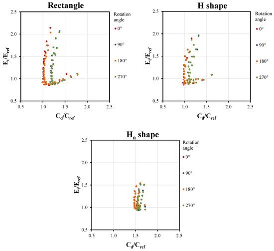 For the other building shapes, the best design combinations (namely the inflection points of the point set at the bottom left in Figure 2) had similar values around point (1.0, 1.0) in the coordinate system. Nevertheless, the maximum values of Cd/Cref and Et/Eref were different. The courtyard shape had a smaller (Cd/Cref)max (1.4) than the others due to its small building depth, which promotes indoor air convection and helps dissipate indoor heat. In addition, the C shape exhibited the lowest (Et/Eref)max of 1.7. The rectangle and high-rise type had the highest (Et/Eref)max of approximately 2.2, which indicated that for these two types of buildings, inappropriate geometry design led to larger energy consumption than for other building shapes.