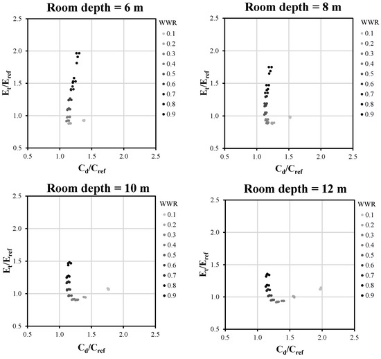 Furthermore, it was seen that the WWR distribution differed for various room depths. For the 6-m room depth, the best design solutions, namely the closest points to the origin, had a WWR of 0.3. However, when the room depth increased to 8 m, 10 m, and 12 m, the WWR of the best design solutions changed to 0.4, 0.5, and 0.6, respectively. This indicated that deeper rooms required larger windows to save energy demand and improve thermal comfort. The reason for this is that larger windows reduce the additional lighting demand caused by the increased room depth as well as the internal heat gain from lighting. Moreover, deep plan buildings also need large windows to promote indoor air circulation and dissipate internal heat, thus reducing the summer discomfort time.