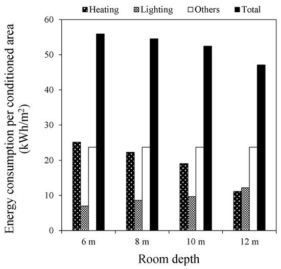 To explore the effect of room depth on energy demand and thermal comfort, the results of the L shape were used as an example and classified according to the four investigated room depths (Figure 4), and the distribution of the results differed as the room depth increased. The results varied along a hyperbolic trajectory as the room depth varied: when the room became deeper, the points extended towards the X-axis direction; when the room became shallower, the points extended towards the Y-axis direction. For a room depth of 6 m, the maximum Et/Eref reached around 2.0 and the maximum Cd/Cref was only 1.4. When the room depth increased to 12 m, the maximum Et/Eref reduced to 1.3 and the maximum Cd/Cref rose to 2.0. This indicated that the deep-plan buildings generally had a lower energy demand and higher summer discomfort time than the shallower buildings. Figure 5 shows the energy consumption for the L shape buildings (south-oriented, 40% WWR) in terms of different room depths. When the room became deeper, the lighting energy increased, while heating and total energy consumption both decreased. The increased lighting energy consumption increased the internal heat gain of buildings. In summer, this contributes to the increase of indoor discomfort time, while in winter the heating energy consumption of buildings can be saved, leading to a decrease in total energy consumption.