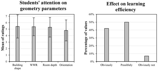 Students paid more attention to the four building geometry parameters by means of ratings ranging from 4.8–5.4 (Figure 6). Orientation had the lowest ratings, while the ratings of the other parameters were almost the same. One of the reasons for the high ratings might have been their potential effects on learning efficiency given that very few students (7%) thought that the building geometry design had “obviously no effect” on learning efficiency. Approximately 42% of students thought that it had an “obviously effect” on their leaning efficiency, and 50% of students thought that the effect could “possibly exist”.