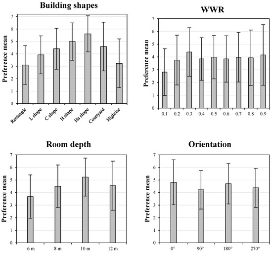 Figure 7 shows the mean and standard deviation of the student ratings for various building geometry factors. For building shape, the Ha shape exhibited the highest mean score (5.6), while the rectangle and high-rise type had the lowest score (3.1 and 3.2, respectively). The H shape ranked second with a high score of 5.0. This indicated the students’ fondness for complex forms, and tiredness of monotonous shapes, which was consistent with Aitken and Hutt’s findings for 7–10 year old children [52]. In addition, the L, C, and courtyard types ranked in the middle with scores around 4.00. Furthermore, there was disagreement in rating the courtyard and high-rise type, since their standard deviations were the highest (2.0). The standard deviations of the other shapes were smaller (approximately 1.5), indicating less disagreement.