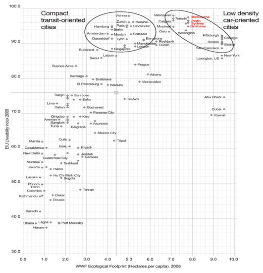The negative consequences of low-density sprawl are well established and involve economic and environmental performance in addition to the social consequences identified above. The economic cost of providing new physical infrastructures to greenfield development has been estimated as two to three times that for redevelopment in established areas [10,11]. Outer suburban residents in cities such as Melbourne also drive over 60% more kilometers per household as driver or passenger compared with inner city residents—a growing time and productivity impost for both the household and metropolitan economy [12]. Environmental costs of continued urban sprawl are considerable. While Australia’s major cities have been designated among the most livable in the world, they have been demonstrated to be currently among the least sustainable. Figure 1 illustrates this clearly, where the vertical axis maps livability across 140 cities based on the Economist Intelligence Unit’s Livability Index and the horizontal axis represents an estimate of their ecological footprints that encompass both resource use and carbon emissions [13,14]. The urban footprint of Australian cities has also been identified as a major concern in the latest national State of Environment report [15], highlighting the continued loss of productive agricultural land on the peri-urban fringe to greenfield development—reducing an important source of fresh produce close to the city, increasing food miles and carbon footprints.