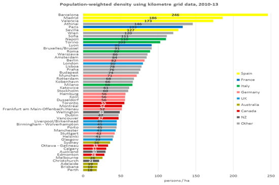 Figure 2. Comparing population-weighted density of Australian, European, Canadian and New Zealand cities. Source: [21]. - transition in type and scale of urban housing redevelopment. Infill needs to assume a dominant role in increasing the supply of medium-density housing—the “missing middle”—in the established middle ring low-density suburbs—and at a scale of redevelopment beyond that of knock-down-rebuild [20]. Table 1 illustrates the dominance of single-story detached dwellings in Australian capital cities but points to a shift beginning to occur in the supply of higher density housing.