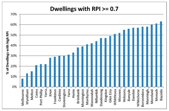 Percentage of greyfield residential properties in Melbourne municipalities with residential redevelopment potential above 0.7. Source: derived by the authors from data provided by Department of Environment Land Water and Planning.