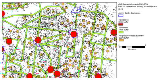 There is a significant volume of greyfield residential property in Australian cities, estimated at over three quarter of a million dwellings for Melbourne and concentrated primarily in the middle ring suburbs [25]. Figure 3 reveals that at least one third of Melbourne’s local government areas have a majority of their residential properties where more than 70% of value is in the land. However, most of these municipalities are restrictively zoned in a manner that, to date, precludes more intensive forms of redevelopment, much less regeneration and reactivation. In a recent audit of infill redevelopment in Melbourne, Newton and Glackin [20,26] found that greenfield development still represented approximately 50% of net new dwelling construction; brownfields were contributing around 25%, predominantly via high-rise apartments; and the greyfields the remaining 25%. Here, almost half were “knock-down-rebuild” (KDR) where detached housing is demolished and replaced by one larger dwelling or between 2 to 4 townhouses—dwelling types that can be accommodated within existing planning and building regulations. Less than 15% is medium density. It represents the “missing middle” of Australia’s housing stock. Most greyfield housing redevelopment is also located outside of the designated zones where state and local governments are seeking higher density forms of residential redevelopment: along major transport arterials, near railway stations and within a range of activity centers—the Residential Growth Zones (Figure 4).