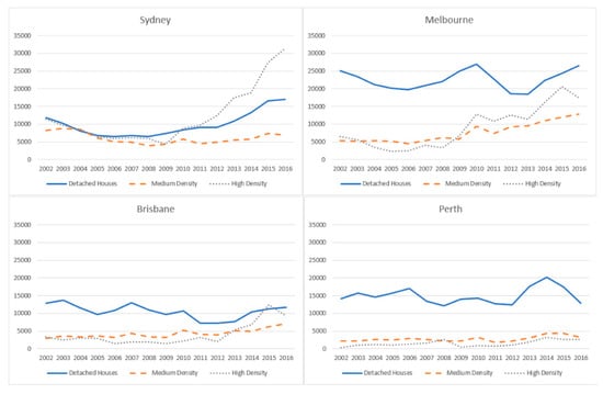 For over a century, the urban fabric of Australian cities has been able to transition from that of a walking city to a transit city and subsequently to an auto city as a result of the transport technologies and land use configurations they have been able to support within the average 30 min daily travel time commute [59,60]. Residential densities declined, as lower priced land in greenfield developments offered households access to house and land packages with private front and back yards in a garden city environment. This constituted the Australian dream for the traditional nuclear family of the 20th century. A review of housing preference studies that date to the early 1990s confirms this, with detached housing consistently nominated as the favored dwelling type by approximately 90% of capital city residents in all surveys [61].
