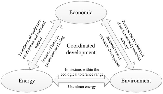 The coordinated relationship among the economy, energy, and environment is shown in Figure 1. Its specific performance is as follows. The environment is the foundation of economic development. The environment, as the material condition of economic and social development, can both promote and hinder the development of economy. Environmental pollution and ecological damage have become important factors that endanger people’s health and restrict economic and social development [1]. The economy influences the environment. Economic development has two impacts on the environment. One is positive, that is, the ecological environment is protected, and resources are rationally and continuously used through the coordinated development of the economy and environment [4]. The other is a negative effect, i.e., that inappropriate economic development will lead to the destruction of resources and the ecological environment. Energy is the necessary factor for economic development. Economic development is based on energy, and energy is the material base of economic development [2]. From an economic point of view, the relationship between energy and economic growth is manifested in two aspects. On the one hand, economic growth depends on energy, that is, energy is the most important part of economic growth. On the other hand, the development of energy should be based on economic growth, because economic growth can lead to large-scale development and utilization of energy [5]. However, energy, as an economic motive factor, is also an obstacle. The gradual depletion of energy and the environmental problems caused by energy will seriously hinder economic development [6,7].