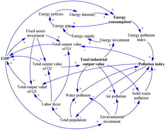 - The feedback path of each subsystem of 3E based on the above two points is as follows. Economic subsystem (According to the division of China’s National Bureau of Statistics, primary industry is agriculture, forestry, fishery and animal husbandry; secondary industry is mining, manufacturing, electric power, the production and supply of gas and water, construction; and the tertiary industry is the service industry.): The total output value of the secondary industry → GDP → fixed assets investment → the total output value of the primary industry (Q1)/the secondary industry (Q2)/the tertiary industry (Q3) → GDP. Energy subsystem: Total industrial output value → energy investment → energy supply → energy gap → energy policies → energy intensity → energy consumption, and GDP → energy consumption. Environment subsystem: Total industrial output value → energy consumption → energy pollution index → pollution index, and total industrial output value → water pollution/air pollution/solid waste pollution → pollution index.
