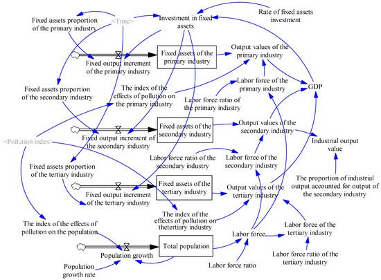 The fixed output increment of each industry is shown in Formula (1), which is the total fixed assets investment multiplied by the fixed assets ratio of each industry. The output value of each industry is shown in Formula (2). We set the industrial fixed assets as the internal circulation factors, the labor force as external inputs, and used Cobb-Douglas (CD) function to represent the conversion mechanism of industrial fixed assets investment and output value. In addition, we consider that the output values of Q1 and Q3 industry will be affected by industrial production pollution; thus, the output values of Q1 and Q3 will be multiplied by index . GDP is the total sum of the output value of three industries, as shown in Formula (3). Population growth is determined by population growth rate and population and is affected by environmental pollution, shown as Formula (4).