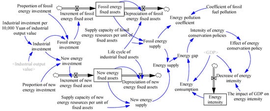 An SFD of the energy subsystem is shown in Figure 4. An energy subsystem is a large system including energy development, transformation, supply, storage, regulation, management, and application. Energy is the basis of economic development, so the energy subsystem is also the material base of the system. This system takes the total energy consumption as the primary assessment variable, which is determined by the industrial output value and GDP [6]. Therefore, the economic subsystem and the energy subsystem are connected. The energy pollution coefficient generated by energy consumption connects this system to the environmental subsystem.