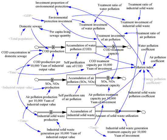 We mainly consider water pollution, air pollution and industrial solid waste pollution as environmental pollution products, where water pollution includes sewage and industrial waste water. The amount of chemical oxygen demand (COD) production is the index of water pollution (COD is the amount of redox substance in water samples by using a chemical method for measurement purposes, which is an important and rapidly determined organic pollution parameter in water pollution management). Air pollution mainly refers to sulfur oxides and nitrogen oxides. In the process of economic development, pollution will continue to occur, but at the same time, it will also be dealt with through environmental protection investment. In addition, the model also considers COD and air pollution self purification ability (coefficient of self purification) [27]. The pollution coefficient of the environmental system is finally determined through synthesis of the above process. The main formulas in the model are shown as follows, and the expressions for the rest of the basic formulas in the model are given in Appendix A.
