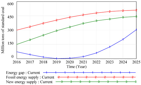 The simulation results of fossil energy supply, new energy supply, and the energy gap are shown in Figure 7. It shows that, on the one hand, as GDP continues to grow, energy investment grows, so fossil energy and new energy supplies continue to grow; however, the increase in fossil energy and new energy supplies gradually decreases with slower annual GDP growth. According to the data, the proportion of new energy investment gradually increases, and the proportion of fossil energy investment gradually decreases, but the latter is always higher than the former. Thus, the fossil energy supply is always higher than the new energy supply, but its growth rate is lower than that of the new energy supply, i.e., 510 and 443 million tons of standard coal in 2025, respectively. On the other hand, during the period from 2016 to 2018, the energy gap gradually decreases and tends to 0, and energy supply and demand gradually balance. However, from 2019, as the annual energy supply increments gradually decrease while energy consumption increases rapidly, the energy gap gradually increases and becomes faster and faster, reaching 304 million tons of standard coal in 2025.