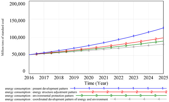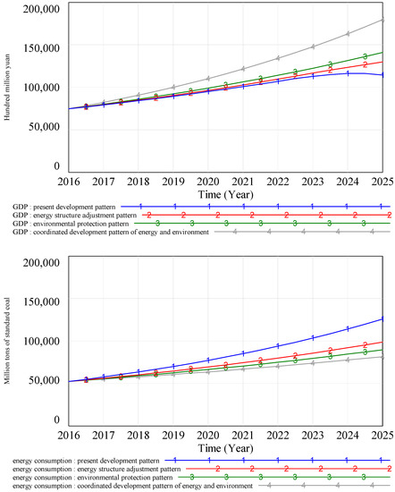 - The environmental protection pattern: This pattern emphasizes the impact of increased investment in environmental protection on environmental quality improvement. Under the premise of rapid development of industries and constant energy consumption structure, we use the table function to advance the investment proportion of environmental protection to 4% and 6% when the pollution index reaches 40 and 60, respectively. The results show that GDP, energy consumption, and the pollution index continue to increase. GDP further increases to 14.11 trillion Yuan compared to that of the energy structure adjustment pattern, and energy consumption and the pollution index further decrease to 8.97 trillion Yuan and 52.03 in 2025, respectively. The GDP growth rate is about 7.2%. It shows that the quality of the environment will be improved, and the 3E system will be sustainable developed.