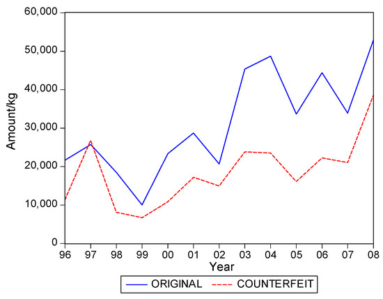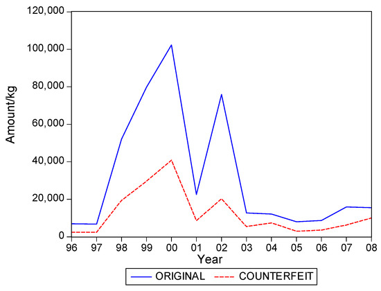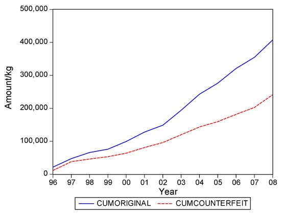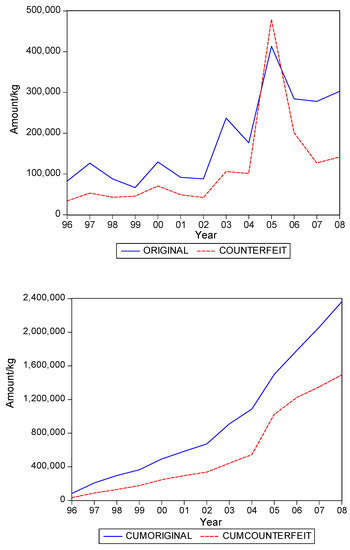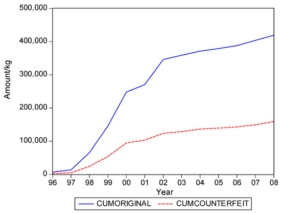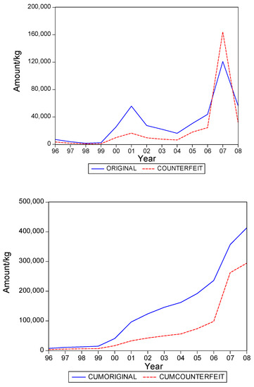 Shipments and cumulative shipments of original and falsified products: Medicine, for sale small scale. Vertical axis is the amount and horizontal axis is the year.