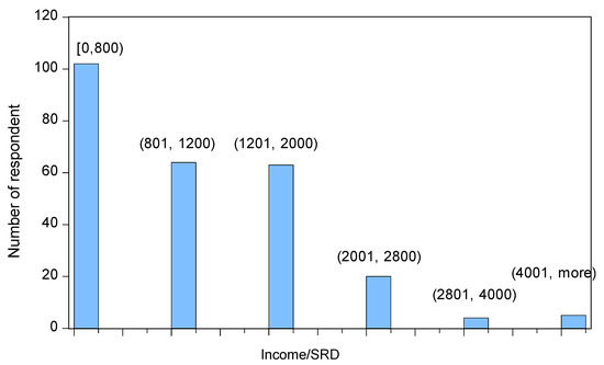 40% of all respondents had a monthly income with a maximum of Surinamese Dollar SRD800 (approximately Euro183 or USD 246). The monthly income for the 2 subsequent categories (between SRD800 and SRD1200 and between SRD1201 and SRD2000) was about 25% for each category. Only 11% of all respondents had a monthly income of at least SRD 2001 (approximately Euro616 or USD470). A histogram is provided in Figure 6.