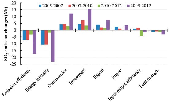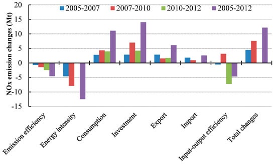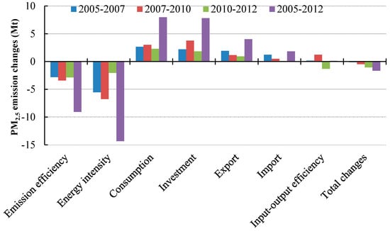 The air pollutant emissions are different from carbon emissions. Because these air pollutant emissions from each sector/subsector were calculated from the activity data, technology-based uncontrolled emission factors, and penetrations of control technologies, the emission factors were different during different periods. The proportion of different fossil energy types in China changed very slightly during our study periods, and the emission factors played the most important role in this effect, so it was called “emission efficiency”, which means the air pollutant emissions per unit of fossil energy consumption. Even though the energy types were not distinguished, it can still reflect the emission efficiency in the process of energy consumption. Figure 1, Figure 2 and Figure 3 show that there were similar impacts of various effects on the changes in NOx, PM2.5, and SO2 emissions during the periods 2005–2007, 2007–2010, 2010–2012, and 2005–2012. On the whole, the emission efficiency and energy intensity effects were negative, and had great inhibitory impacts on emissions increments. The energy intensity effect greatly decreased NOx (−12.49 million tons, Mt), PM2.5 (−14.33 Mt), and SO2 (−23.06 Mt) emissions during 2005–2012. The factors related to economic growth, such as investment, consumption, and export promoted NOx, PM2.5, and SO2 emissions, especially the investment and consumption were the key promoting effects on these emissions.