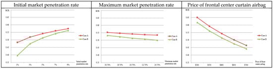 The BCR is sensitive to certain variables; consequently, a sensitivity analysis must be conducted with regard to the important variables [15]. We examine the BCR values for the US, as well as how they are affected when the initial market penetration rate, maximum market penetration rate, and price of the safety system are changed. The price of the frontal center curtain airbag is high, and most customers would be sensitive to price. Accordingly, we perform a sensitivity analysis of the price of the safety system. The results are shown in Figure 4 and Appendix D. When the product penetrates the target market rapidly—high initial and maximum market penetration rates—the BCR of the frontal center curtain airbag increases. Conversely, the BCR decreases when the price of the frontal center curtain airbag increases. Thus, firms need to consider higher penetration rates and lower price strategies.